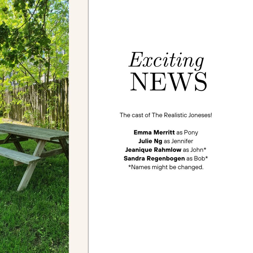 We would like to take this opportunity to thank the people who came out to audition for The Realistic Joneses! We saw a lot of great talents and electric chemistry, and hope that you will audition again for our next productions in 2025.